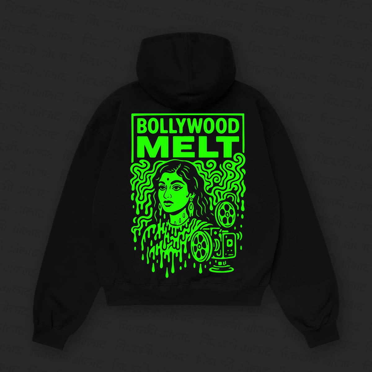 This hoodie is what happens when you binge-watch 70s cinema on a fever dream. The back features a striking, white-on-black illustration of a classic Bollywood beauty, but with a twist—she is literally melting. Surrounded by dripping film reels and a vintage camera, and crowned with the bold text “BOLLYWOOD MELT,” this design captures the surreal, overwhelming nature of Indian cinema.