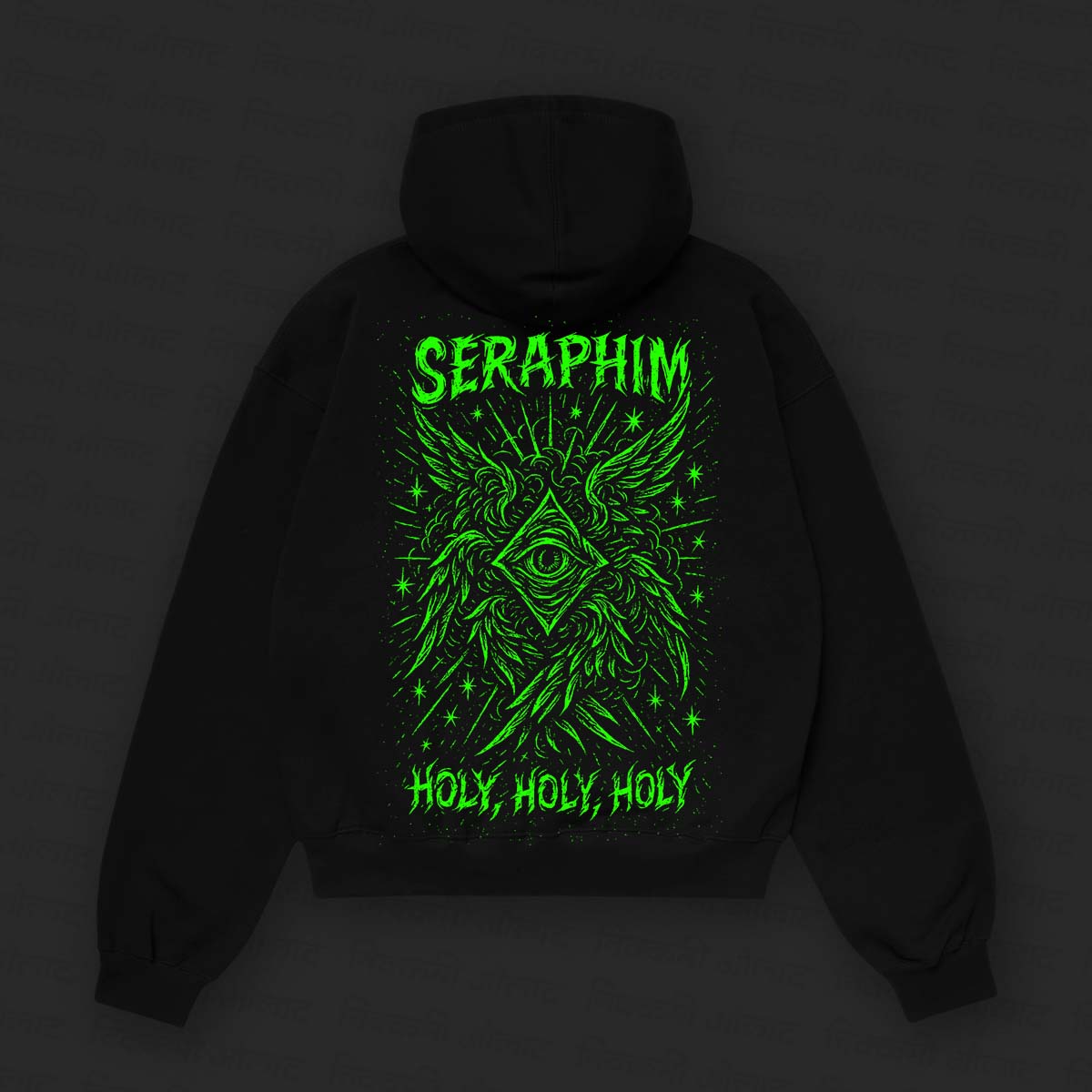 This hoodie features a stunning, woodcut-style illustration of a Seraphim centered around a piercing eye. Flanked by the text “SERAPHIM” at the top and the trishagion “HOLY, HOLY, HOLY” at the bottom, this piece is pure dark aesthetic fuel.