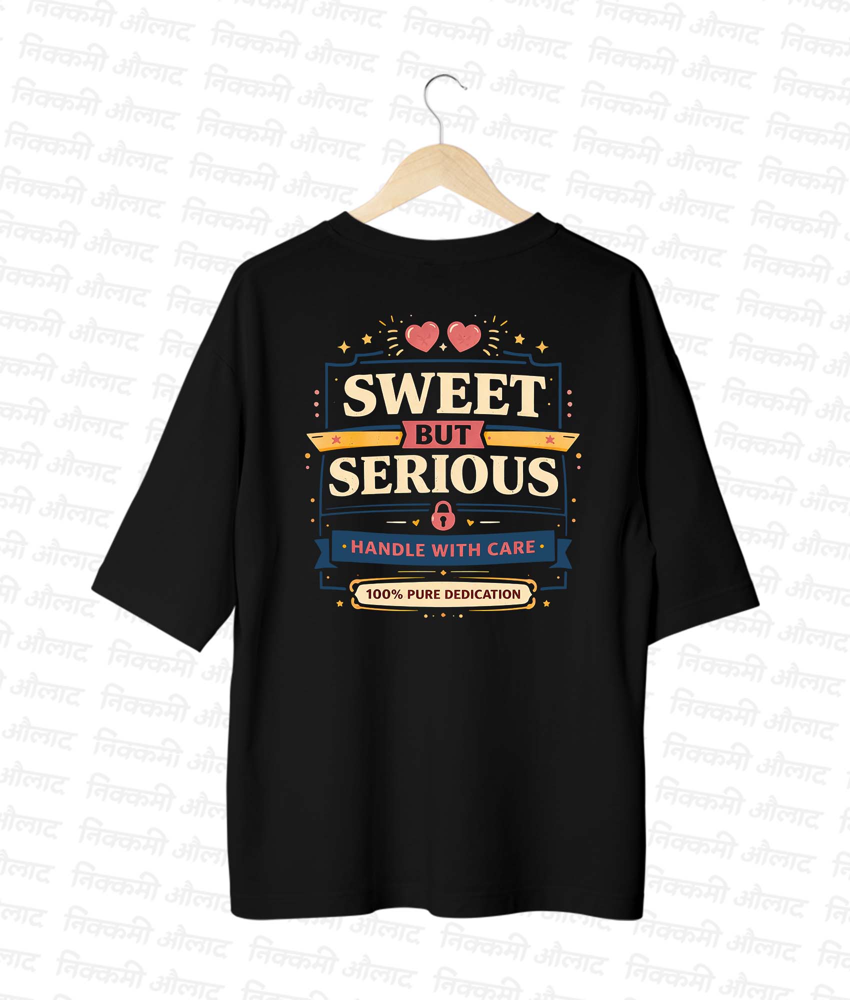 The back features a beautifully detailed, vintage-style blue and gold badge that acts as your personal instruction manual. The bold text “SWEET BUT SERIOUS” is locked down with a padlock icon, symbolizing that your energy isn’t open to just anyone. The label includes critical handling instructions:
