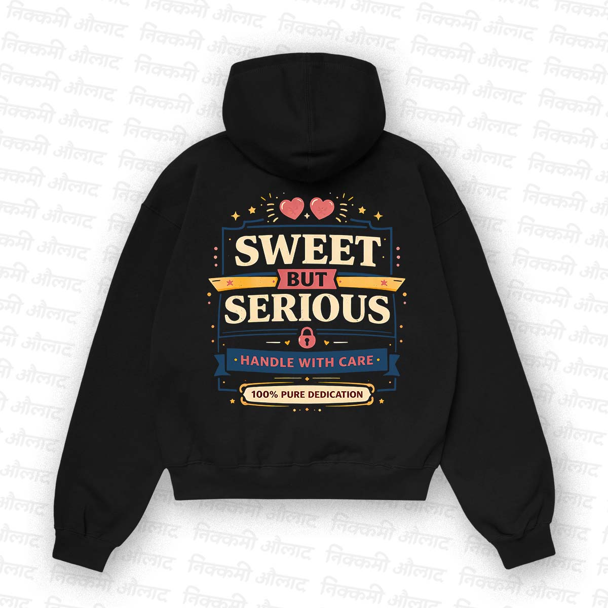 The back features a beautifully detailed, vintage-style blue and gold badge that acts as your personal instruction manual. The bold text “SWEET BUT SERIOUS” is locked down with a padlock icon, symbolizing that your energy isn’t open to just anyone. The label includes critical handling instructions: