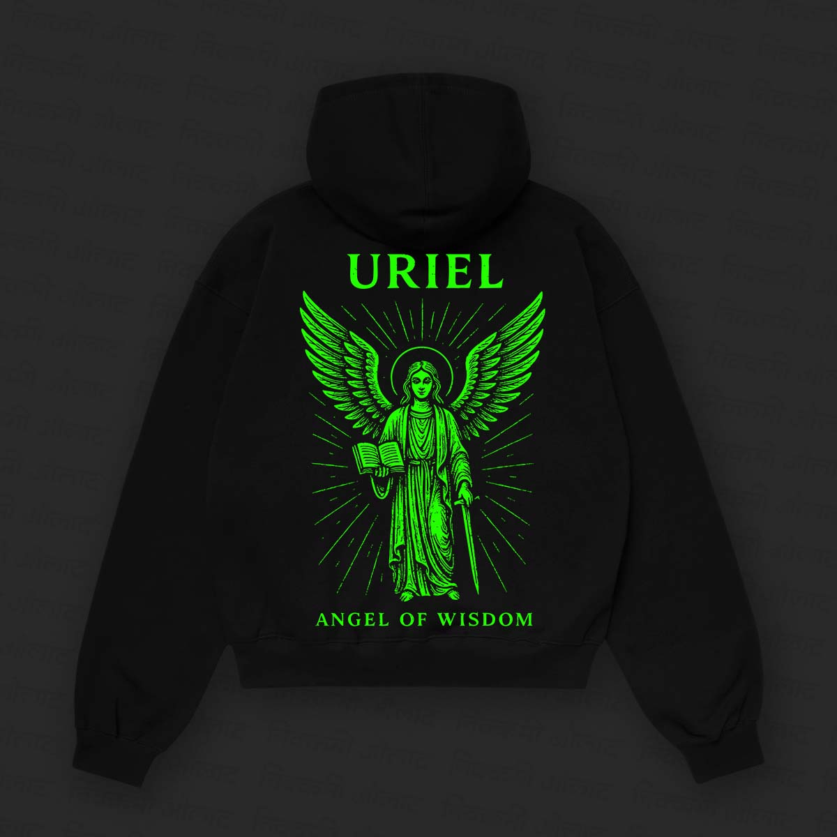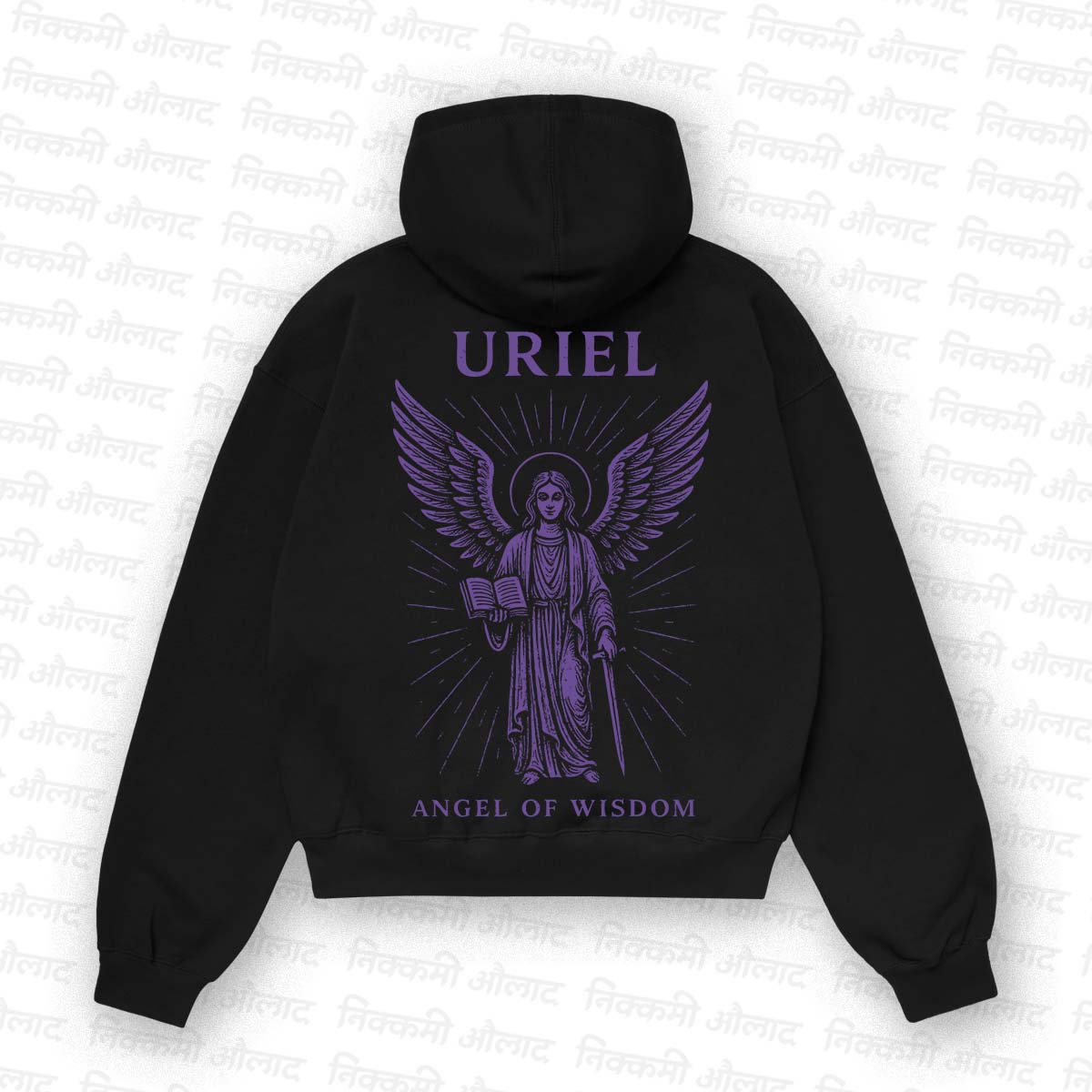 This hoodie features a majestic, woodcut-style engraving of Uriel. The design showcases the angel with powerful wings, holding a book of knowledge in one hand and a staff in the other, symbolizing authority. The bold text “URIEL” crowns the top, while “ANGEL OF WISDOM” grounds the design at the bottom.